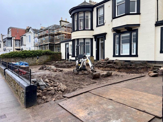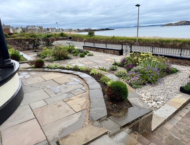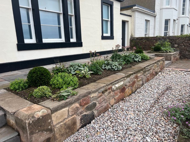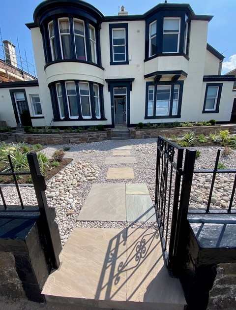 Stone paving slabs were set into soft grey Scottish pebbles from the front gate up to to the steps to the front door. Two new plant beds with metal edging were designed with evergreen planting in the Scottish pebbles. A range of different seizes of pebbles were used to add textural interest. Room was left to add a seat to sit and relax and enjoy the marvellous views.