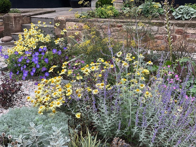 Perennials including Stachys byzantina, Geranium ‘Rozanne’ and G. sanguineum, Anthemis ‘E C Buxton’, Eryngium varieties, Blue Agapanthus, Nepeta, Acanthus mollis, Achillea ‘King Alfred’, Perovskia ‘Blue Spire’, Armeria, Stipa tenuissima.