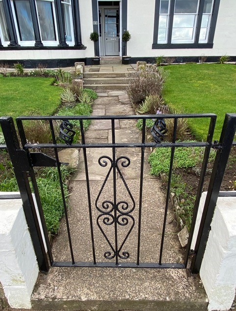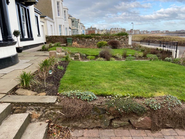 The Clients had inherited the front garden, which had a worn pathway and steps to the front door, flanked by two traditional raised areas of lawn and flower beds. A worn pathway ran around the front of the house, narrow in places, with mixed surfacing of concrete and stone. There were two stone side boundary walls and a low front wall with metal railings and metal gate. On each side of the garden area were car parking pavior driveways, which the Clients wished to keep.